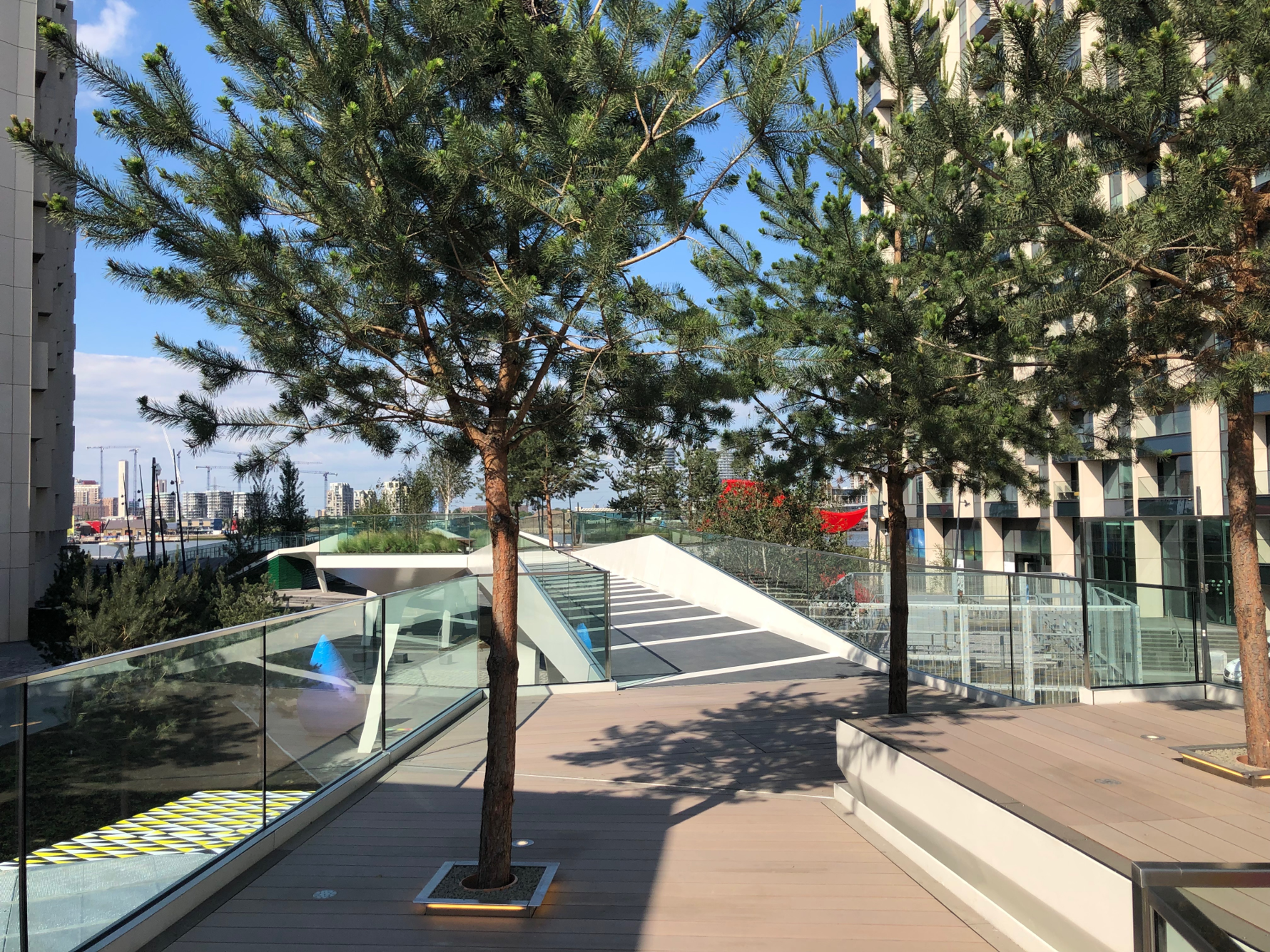 In recent years GROSS. MAX. has worked on the transformation of Greenwich Peninsular into a high density mixed urban development and optimizing its unique waterfront location in a sweeping meander of the River Thames. The contribution of GROSS. MAX. involved the overall landscape master planning of waterfront, residential districts, transport interchange and the central park from strategic concept down to detailed resolution and onsite construction supervision. In collaboration with Diller, Scofidio + Renfro and AKT II we designed ‘The Tide’ which will over time form part of a layered 5 K network of public spaces and gardens embedded in the daily rhythms of Greenwich Peninsula. The Tide segment is conceived as a series of elevated, landscaped islands where the public is invited to slow down, linger and overlook the life of the Peninsula. Each island is distinct, defined by trees and planting, and by their surrounding views and sounds. The elevated gardens are designed as clusters of structural supports that create elevated planter beds, containing soil and channelling both gravity loads and water down to the ground. The Tide gardens above also frame and shelters the path below, creating arched pavilions that mark the thresholds and passages at the ground level public realm. The clustered planting of trees consists of native birch and pine. Tree planting along the waterfront consists of native waterside trees such as Alnus, Salix and Poplar. Sweeps of groundcover, herbaceous plants, seasonal bulbs and ornamental grasses enhances the atmosphere with additional colour and texture. A striped pattern marks the path of the Tide, emphasising the tempo of movement between cultural and social destinations as an orientation and wayfinding tool. The continuous pattern is rendered in a thin layer of epoxy for elevated portions, while asphalt and granite Portuguese paving stones is used for the ground level.