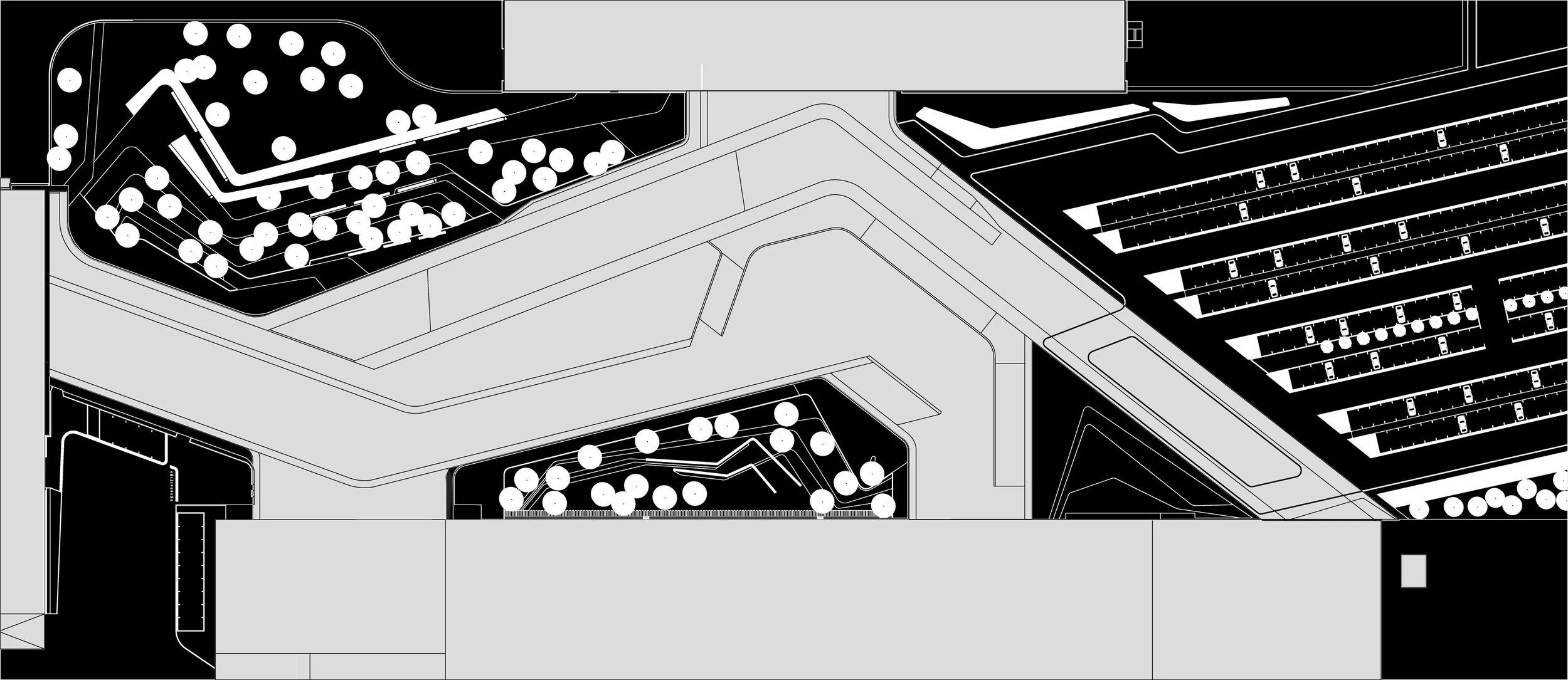 In 2002 Zaha Hadid Architects in collaboration with GROSS. MAX. won first prize in the international competition for the Central Building and landscape design for the new BMW factory in Leipzig Germany. Subsequently GROSS. Max. was commissioned to design the 200-ha site into a fascinating new landscape for car production which provides a link between radical architecture, functional use, flexible site development, and ecological considerations. This was our first collaboration with Zaha Hadid and at and interesting moment in time when Zaha Hadid was interested in topography and landscape to suggest alternative ways to deal with a large building. The BMW project allowed the team to envisage the surrounding landscape and the inhabited surfaces of the architecture as a continuous system. The combined building and landscape were designed not only to be predominantly functional, but equally with representational requirements, presenting the BMW brand in an almost cinematic way. The Central Building designed by Zaha Hadid Architects is the active nerve center of the whole factory complex, the point where all threads of activity gather and branch out. According to Zaha Hadid: “The Central Building was conceived as an open, city-like space where public, professional and production activities converge and where the social and spatial hierarchies of the traditional workplace are broken down”. The radical rethinking of established paradigms that generated the interior solution was brought to bear on the exterior components as well. The intrinsic problems of a large parking lot in front of a building were avoided by turning it into a dynamic spectacle. The inherent dynamism of vehicle movement and a vast field of car bodies are revealed in the arrangement of parking lots, which allow the whole field to move, colour, and sparkle with swooping trajectories that culminate within the building. Various landscape fields-water/reed poplar trees, coppice-are integrated into this fluid field. The moving spectacle of the car park is set in contrasting system of water retention ponds. Rows of Italian Poplars are planted with ever decreasing centres towards the central building which causes the illusion of the acceleration of a typical BMW from 0-100 miles an hour. White painted ‘road mark’ cars are occasionally outlined in the normative arrangement of the parking lot. A loose scattering of fruit trees follows the path that penetrates the space between the factories. They create a romantic interlude in the factory’s rigorous production process. The overall landscape design of the new BMW plant relates to the scale and character of the surrounding agricultural landscape. The extensive use of rows of lime trees reflects upon the origin of the name of Leipzig as ‘place of limes.