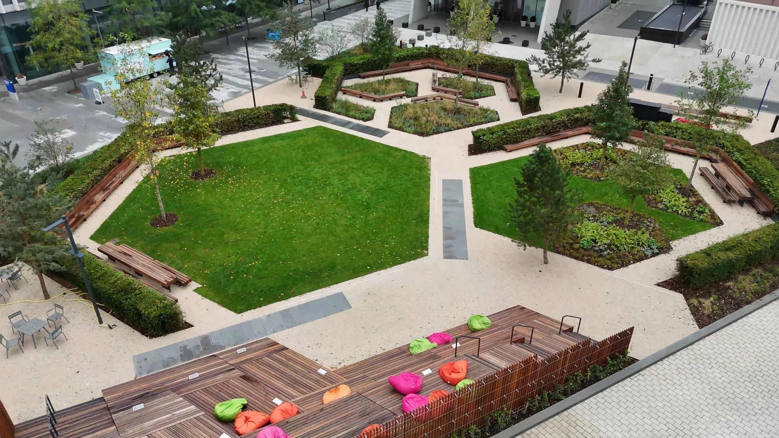 Following consent for the outline masterplan GROSS. MAX. have developed detailed proposals for the first phase of the project, the key infrastructure, central public space and a new landscaped bridge across the LUL Central Line. At the northern campus we designed a new public garden at the heart of White City Innovation District -marking the first permanent public space in White City Deep Tech Campus. This new garden opened in 2024 provides welcoming spaces for students, staff, start-ups and local businesses to meet, host events and find inspiration. The garden comprises lawns enclosed by hedges, mature trees and intimate seating as well as a more extrovert stage like gathering space of wooded seating steps. From here one overlooks the garden below and the wider campus beyond. Within its half-acre footprint, the garden includes several references to the landmark research and innovation activity taking place at White City Deep Tech campus, with hexagonal shapes calling to mind chemical structures, and the two layered hedgerow planting design informed by bilayer cell membranes.