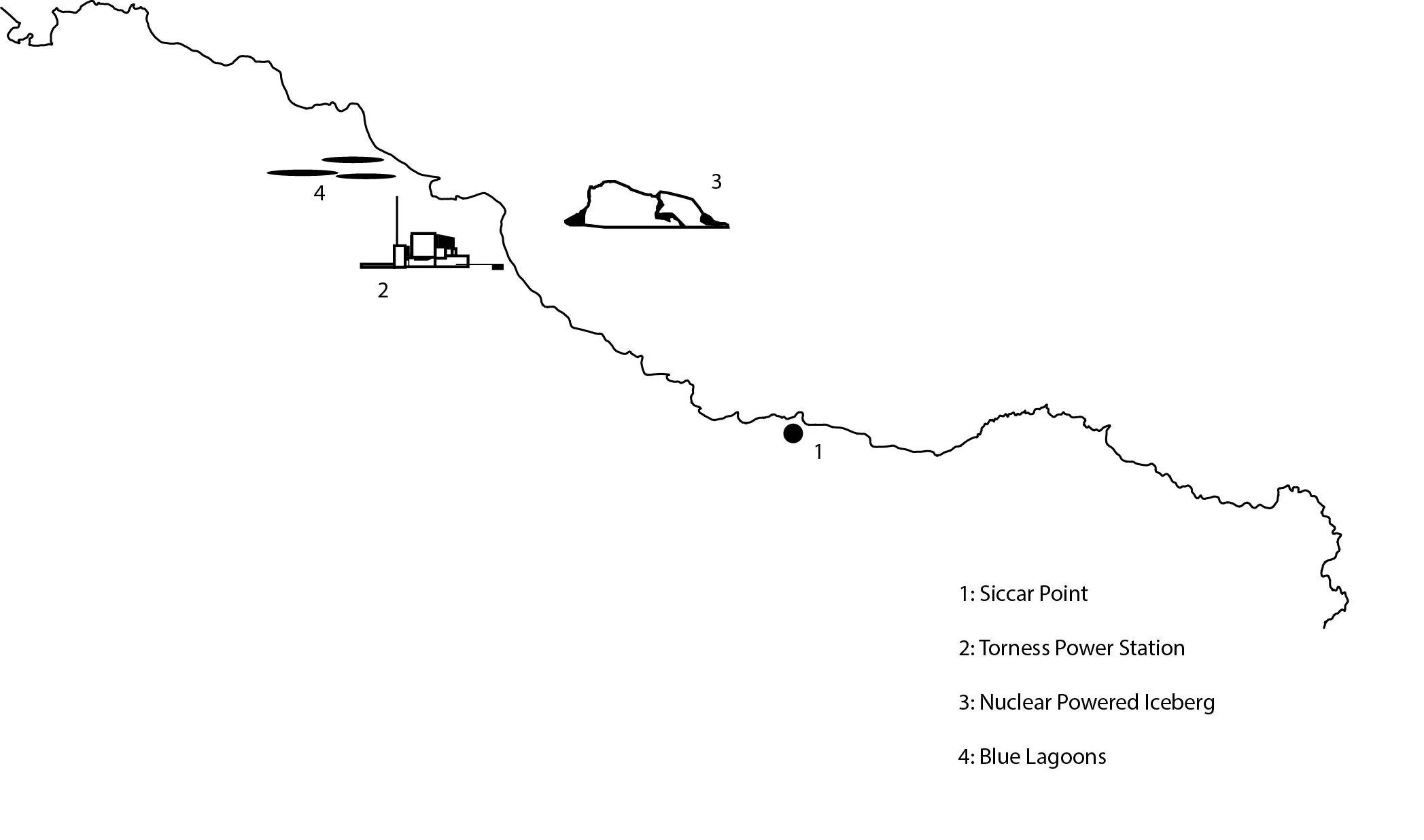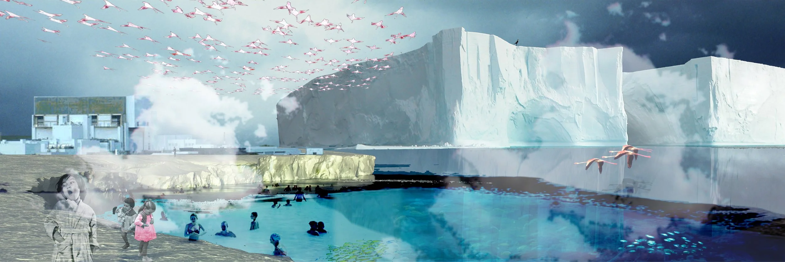 The commission was to propose a coastal machine, a metaphorical device capable of encapsulating the changing social and environmental processes that might impact upon our coastal regions over the next half century. Out of 6000 Miles of Scottish coastline we selected the rocky outcrop of Siccar Point where James Hutton in 1785 found visual confirmation in exposed geological strata for his theory on ‘unconformity’. Hutton perceived the world to be always changing, yielding to the powers of wind and water, heat and cold. Of equal interest, Siccar Point is in close vicinity of Thornes Nuclear Power Station. Our proposal for a coastal machine is that of as ‘climate interchange’. To counterattack the effect of global warming the proposal promotes the concept of local freezing and 'climate interchange' by using Torness Power Station along Scotland's East Coast as a giant cool box to create a nuclear-powered iceberg. The heat generated to cool the iceberg is used to create hot water lagoons in the nearby cement quarry, made a dazzling blue by the limestone rock formation. We believe that people hold a deep desire for climate change; it is after all the most important reason for selecting a holiday destination. The proposal was part of an exhibition about Scotland's coastline entitled 6,000 Miles organised by the Lighthouse, Scotland's Centre for Architecture, Design and the City.