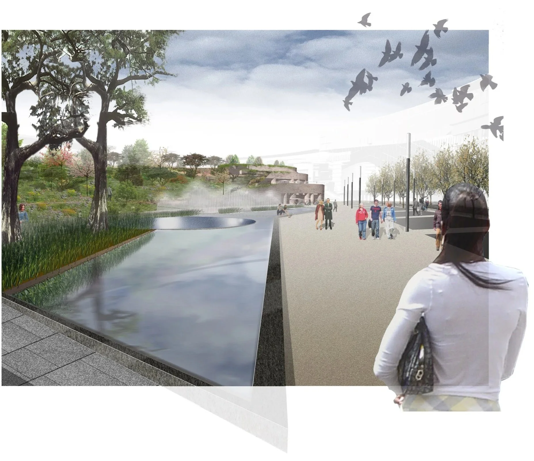 The project reflects upon Liverpool’s unique maritime history. The location for the project is site of the first commercial enclosed tidal dock in the world. How to give expression to such condition? The project reflects upon one story which captured our imagination. It is the story of the tidal journals by Old Dock Harbour Master William Hutchinson who meticulously recorded twice a day the high tides during the 30-year period between 1764-1793. The tidal journals, which only recently have been rediscovered, provided the first systematical tidal measurement in the UK. Most recently researchers utilized Hutchinson’s data to verify the rise of sea level during the 20th century as result of global warming. The proposed water feature consists of a black granite circular ‘lunar pool’ of 9-meter diameter. The lunar pool of still water ‘floats’ in a larger pool that has a rough base. The composition is a play on the contrast of these two elements l]one still and one with movement. The lunar pool represents the lunar cycle and its significance on the tidal range. The old shoreline is represented by grasses and a grove of swamp cypress trees. A 42-meter-long strip of water jets which are programmed to represent the Hutchinson’s high tide measurements. The strip of water jets demarcates the position of the old dock harbour wall. At night images of the age of the moon are projected upon the circular pool whilst tidal jets are illuminated with fibre optic uplighters. The fountains are set in limestone paving with engravings of tidal measurement recording. Scattered trees and seats are integrated in the overall scheme, which provides a transitional space between Chavasse Park and Liverpool’s proposed discovery axis.