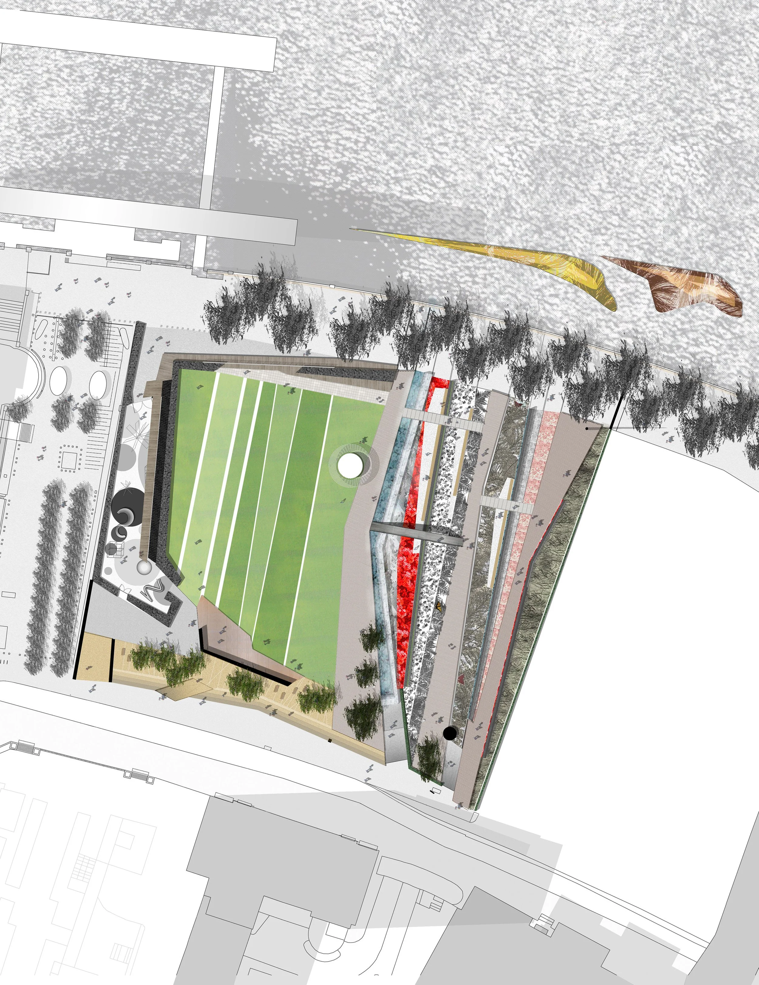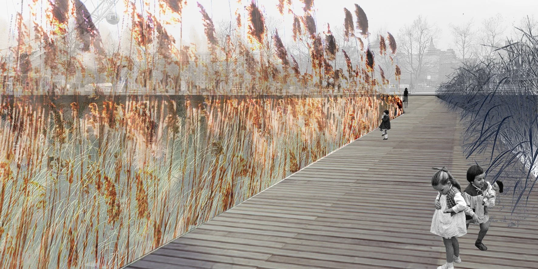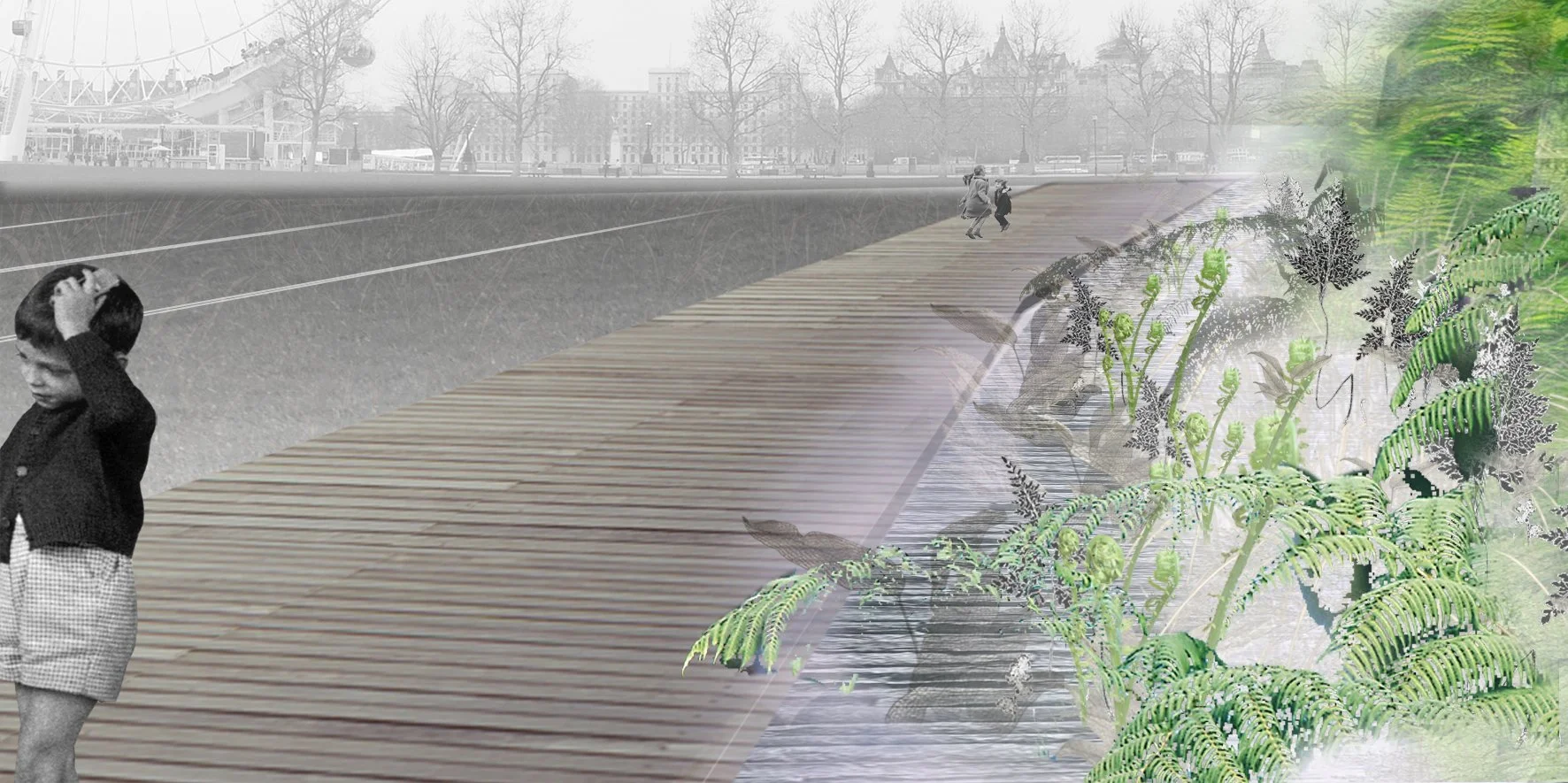 Once the Southbank was a patchwork of river sediments, pleasure gardens and timber wharfs. The invited competition proposal reflects upon the rich cultural and ecological tapestry in a bold contemporary manner. The design is based on a strong contrast between a series of intimate stroll gardens and a large field for events. The gardens show a horticultural extravaganza which include mist gardens, trellises, heated garden walls for the growth of lush exotics, a nocturnal garden to seduce the idle visitor at night and even a series of floating gardens on the River Thames. The selected plants represent the diverse soil types as found on the original Lambeth Marsh and express all seasons not just spring and summer. A series of wooden boardwalks, reminiscent of the former timber wharfs, crosses the gardens between Belvedere Road and River Walk. The idea is that people will filter through the park. Throughout the gardens there are intimate areas for seating and relaxation. The centre stage of Jubilee Gardens is a large expanse of openness. Zen + XTC = Jubilee.