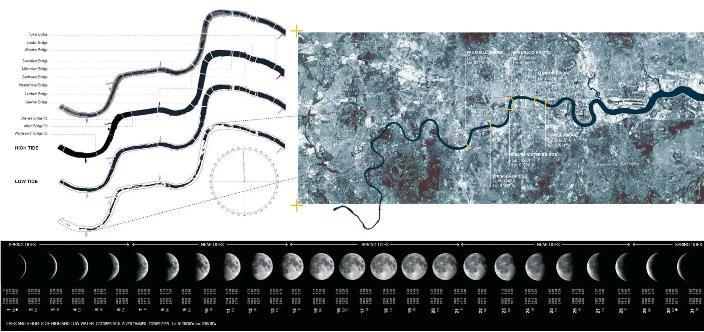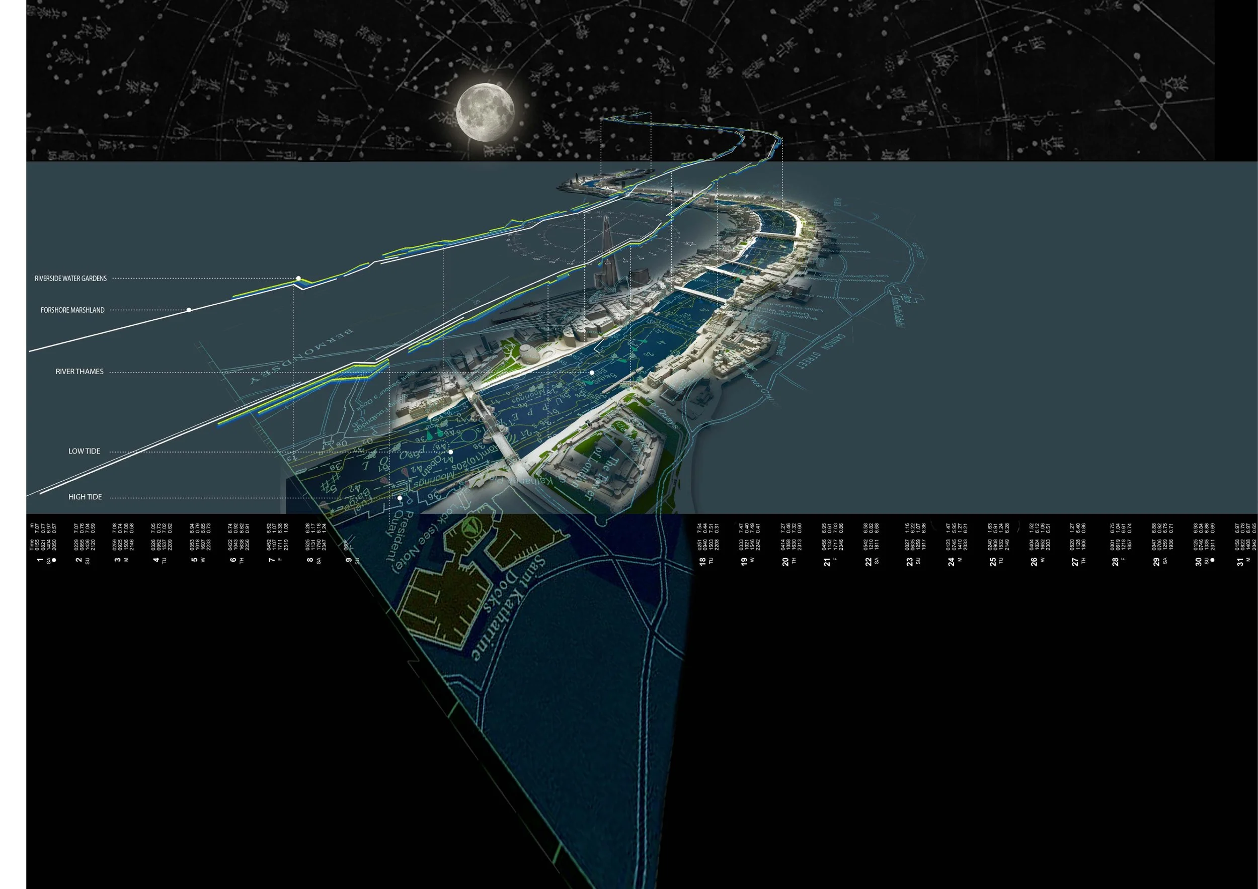The River Thames is London’s greatest landscape asset. The nature of the river’s tides have defined the city, built its history and its significance. Our project will reveal the river as a breathing, pulsing organism and so illuminate the dynamics of this natural estuary. The design illuminates the river walls as a constant thread of light through the city that gently illuminates the expanses of foreshore exposed at low tide. When the tide is low the underbellies of the bridges are revealed by lighting. At high tide, the lighting shifts to illuminate the elevation of the bridges. We envision the Illuminated River project as integral component of a wider –all encompassing – strategy to reveal, optimize and orchestrate the tidal River Thames as a dynamic natural system, and celebrate its fantastic qualities of flux and flow to be made visible and experiential in daily live. We imagine the entire river Thames -its foreshore, tideway, river walls and embankments as well its ‘lost river’ contributories as an innovative and iconic contemporary linear waterside park. Such ambitious city-wide transformation of the River Thames can be regarded as an innovative and iconic 21st century legacy to the great tradition of London parks and gardens. It will create an interlinked system of blue and green landscape ribbons, which promotes biodiversity and urban wilderness whilst optimizing flood control and storm water management to prepare London for the climate of tomorrow. Such scenario will re-orientate the city back to its river and integrate ecology, urbanism and architecture and will reinstate the river as the vigorous ‘missing link’ of an integrated park system and will reconcile urban London and its unique topographic London Basin setting.