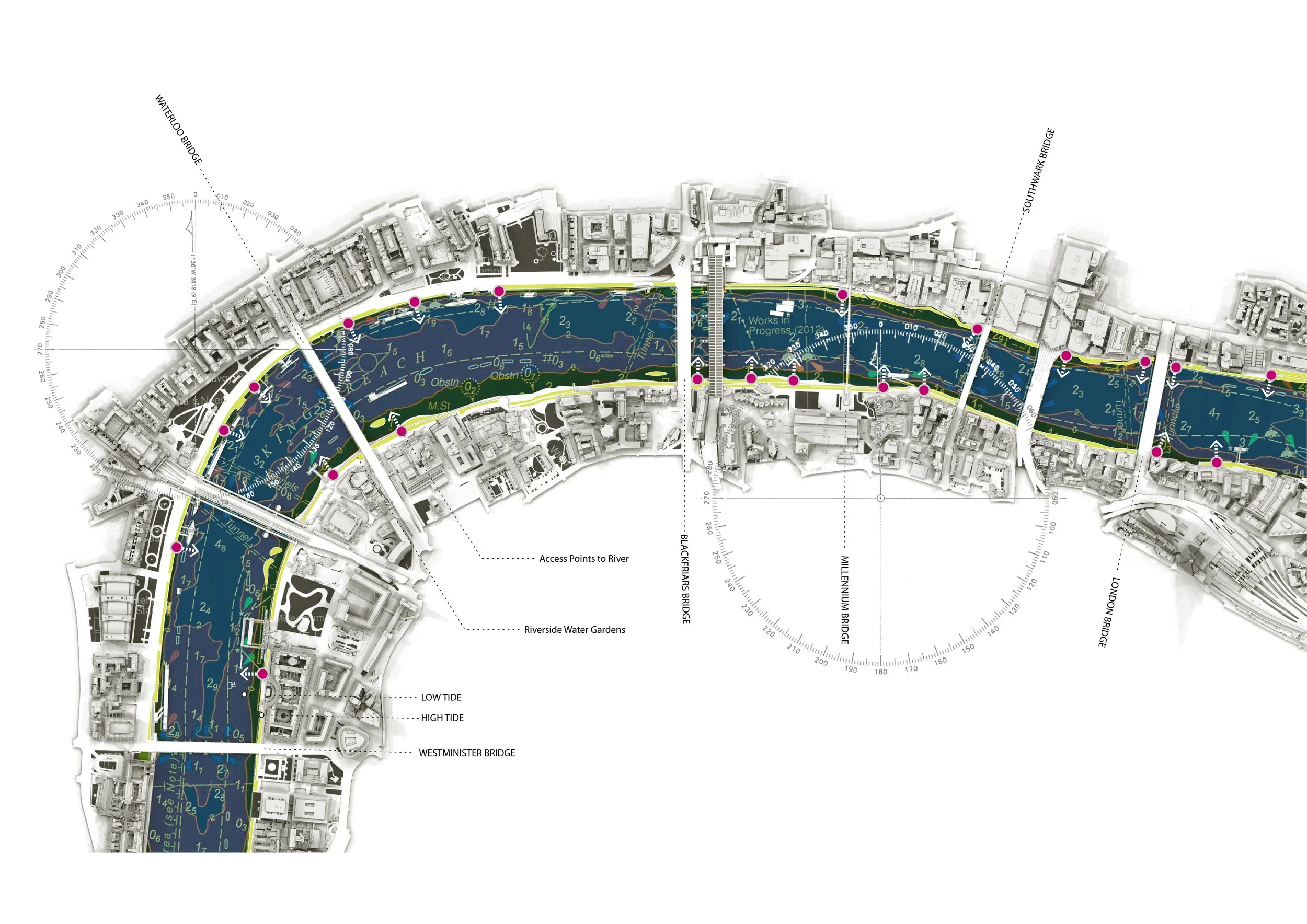 Important part of the vision is to promote increased access to the tidal river foreshore and waterside embankment gardens by means of boardwalks, steps, stairs and landing places. This could become part of a rhythm of distinct architectural interventions combined with fore mentioned waterside gardens.