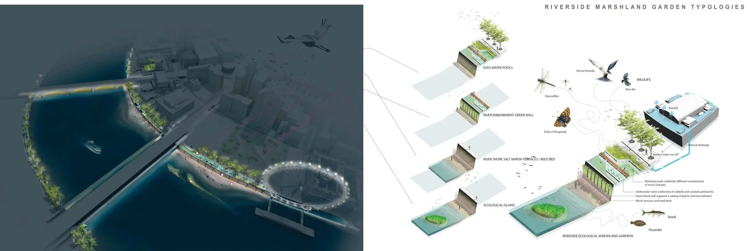 Important is to reintroduce natural process right in the very heart of the city. Our proposal will form integral part of a city wide sustainable urban drainage system and will avoid the current practice of clean rainwater to become contaminated in London’s sewers. Surface water run off will instead become part of an intricate network system composed of green roofs, swales, rain water gardens, retention reservoirs and permeable surfaces. The various riverside marshland gardens will be composed of as mosaic of soil condition representing the original floodplain landscape of the meandering river Thames.